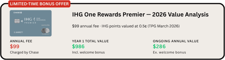The Conservative Caveat: TPG rates IHG points at the lower end of hotel programs. If you redeem strategically (IHG luxury properties in Asia are particularly strong-value targets), you can exceed 0.5¢/pt meaningfully. The 4th-night-free benefit and 20% discount on purchased points are excluded from the table totals but add real upside for frequent IHG stayers.