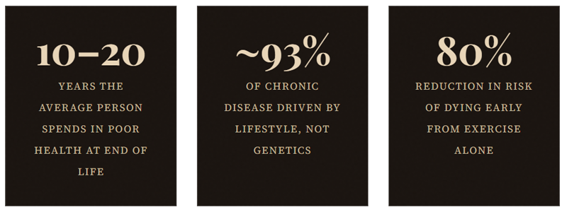 The average person today can expect to live into their late seventies or eighties but the last ten to twenty of those years are often spent managing chronic disease, losing mobility, and fading cognitively.