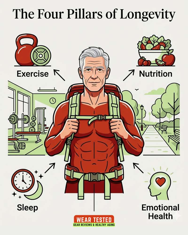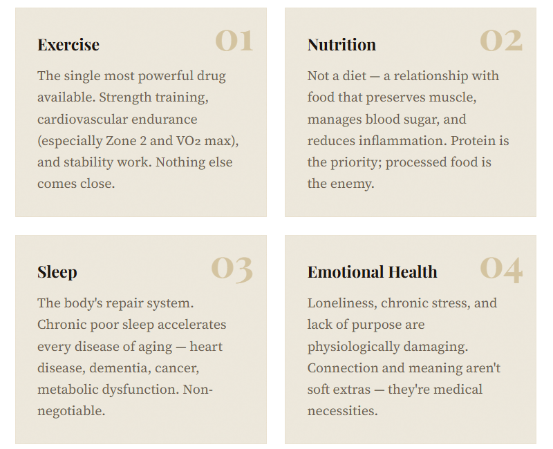 Attia distills the science of longevity into four primary levers. Pull them consistently and you dramatically narrow the gap between how long you live and how well you live.