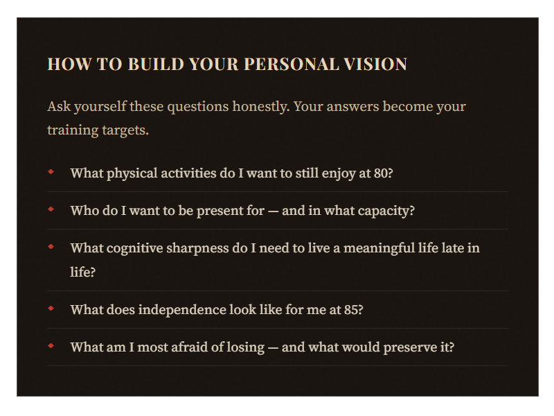Once you know what you’re building toward, you can work backward, decade by decade, to figure out what you need to be doing right now. This is fundamentally different from how most people think about health, which is reactive: we only change when something goes wrong.