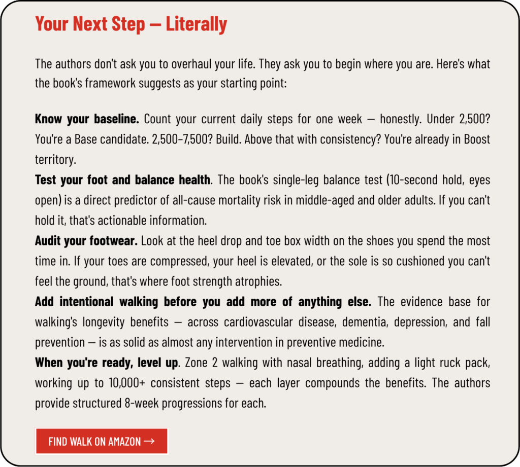 One of the more useful contributions of Walk is its nuanced progression model. Rather than simply advocating for “more steps,” the final chapters sketch an upgrade path from baseline ambulatory health toward genuinely advanced walking-based fitness. Zone 2 heart-rate walking, structured rucking (weighted walking, increasingly documented for bone density, cognitive function, and cardiovascular conditioning), and what the authors call “long-haul walking” are all covered with specific protocols and physiological rationale.