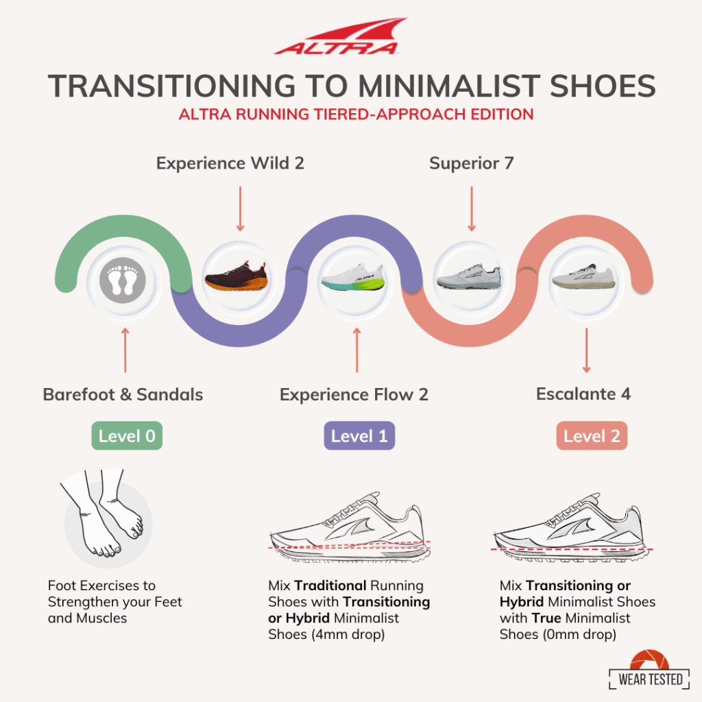 • Transitioning minimalist shoes (like Altra Experience Flow 2 and Experience Wild 2) have moderate cushioning, which makes it more forgiving on your feet and legs during the transition phase.