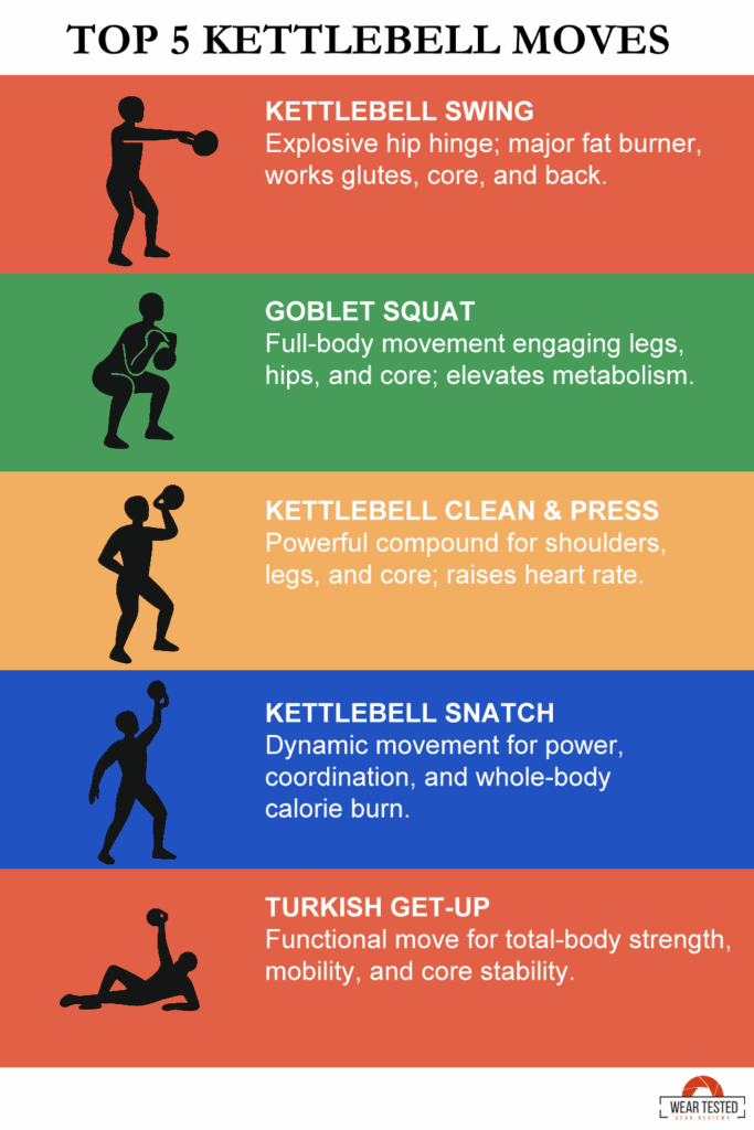Full-body movement engaging legs, hips, and core; elevates metabolism. - Kettlebell Clean & Press