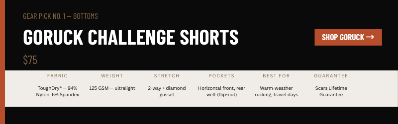 Our entry point into GORUCK’s apparel catalog, and immediately one of the more technically interesting shorts we’ve tested in the context of hot-weather performance. The Challenge Shorts are built on ToughDry – a 94% Nylon fabric that GORUCK describes as the same material used to make the US flag Neil Armstrong planted on the moon. We can’t verify that claim, but we can verify the performance: these things dry absurdly fast and resist abrasion in a way that synthetic running shorts simply don’t.