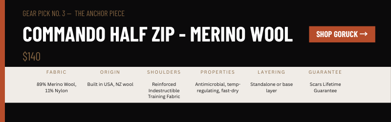 The case for merino in running and cycling is well-documented. The case for merino in rucking is identical but with one additional factor: ruck strap friction on the shoulders. A standard merino wool top – even a high-quality one – will pill, stretch, and eventually fail at the shoulder contact points under a loaded pack. This is the exact problem that drove the British SAS to develop reinforced shoulder panels on their Commando Sweater in the mid-twentieth century. GORUCK has applied the same logic here: a panel of their Indestructible Training Fabric overlaid at the shoulders and elbows, bonded to the merino base.